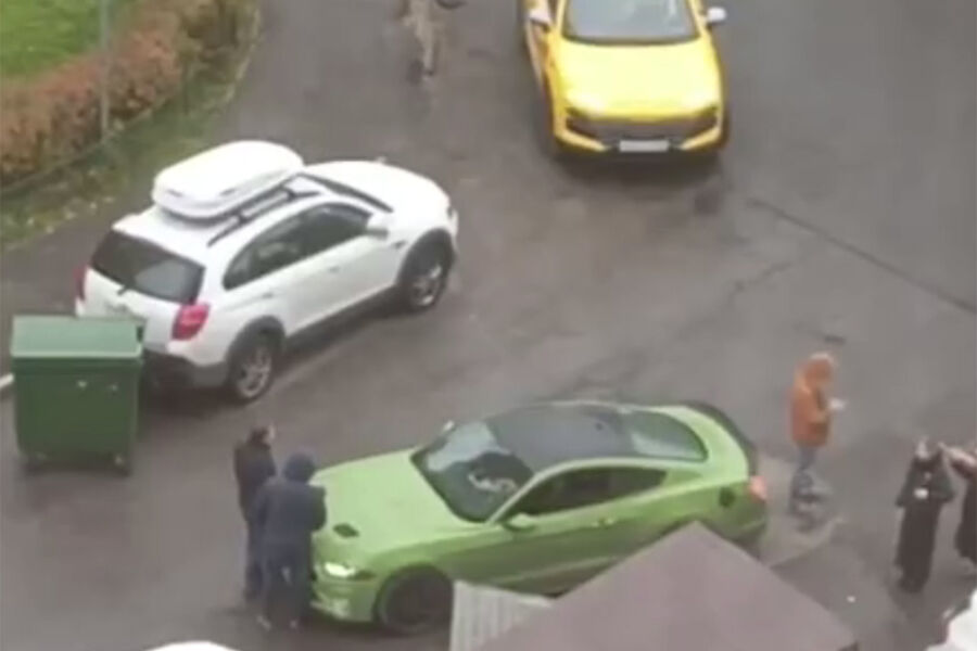 Очевидцы запечатлели инцидент. На кадрах видно, как мужчины стоят перед зеленым автомобилем, тем самым блокируют проезд.