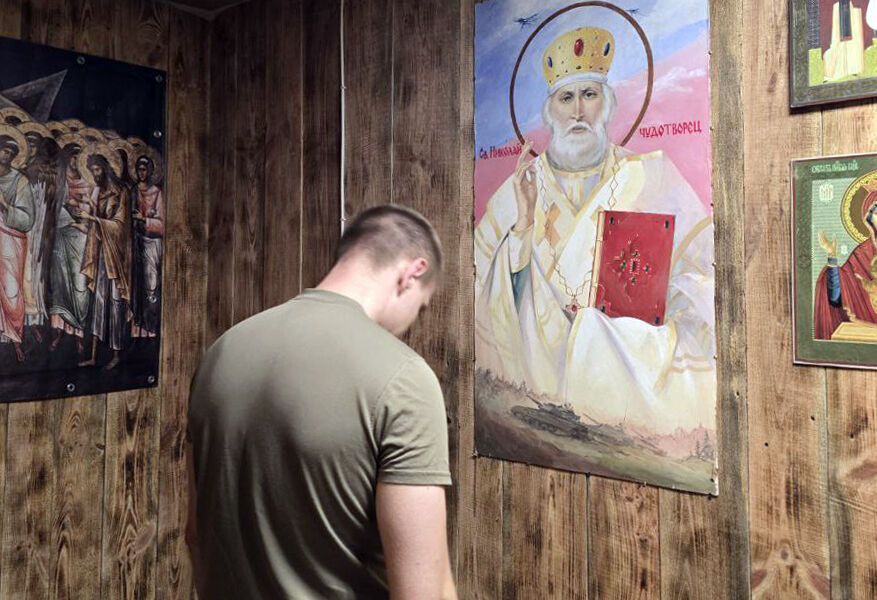 На фотографии запечатлен мужчина, молящийся перед этой иконой в форме российского военнослужащего. Икона представляет собой современную интерпретацию классического изображения Николая Чудотворца — святой держит Евангелие в одной руке, а пальцами другой руки совершает жест благословения. Фон иконы разделен на несколько частей: в небе пролетают самолеты, ниже — движутся танки на земле, а из облаков в белых, синих и красных оттенках складывается российский триколор.