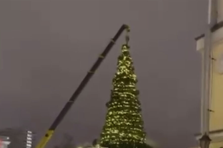 На обнародованных кадрах можно заметить, что у станции метро Театральная в центре города елку зацепили за макушку и начали вращать с помощью крана. Во время вращения на нее накручивалась светящаяся гирлянда.