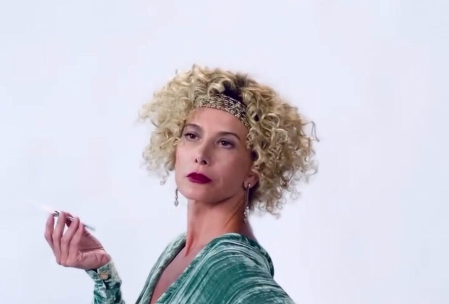 52-летняя Юлия Высоцкая позировала с мелкими короткими кудрями и макияжем с красной помадой и фиолетовыми тенями. Актриса также была одета в лазурное бархатное платье с глубоким декольте.