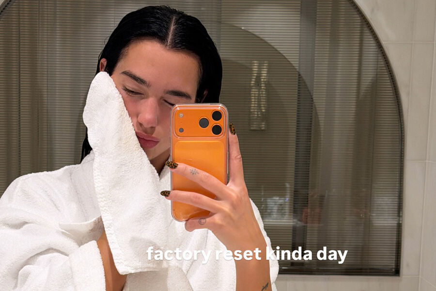 Дуа Липа стояла перед зеркалом в белом халате в ванной комнате. Певица была запечатлена с мокрыми распущенными волосами и без косметики. Артистка протирала лицо полотенцем.