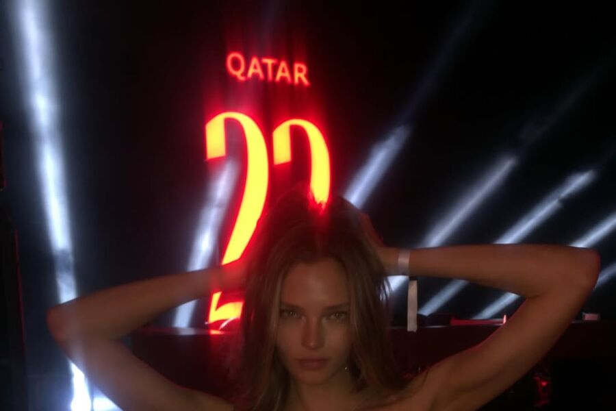 Алеся Кафельникова вышла на публику в платье с разрезами по бокам, которое было украшено серебристыми стразами. Модель позировала с распущенными волосами и макияжем с черными стрелками. Манекенщица была запечатлена на закрытом мероприятии, организованном ливанским брендом Monot.