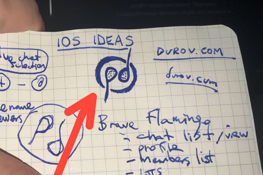 Дуров прикрепил к посту фотографию тетрадной страницы с различными записями и скетчами. Красной стрелкой отмечен прототип логотипа. Он представляет собой две буквы «pd» в виде сперматозоидов, обведенных кругом. Буквы, как предполагается, являются инициалами создателя Telegram, имя которого латиницей пишется Pavel Durov.