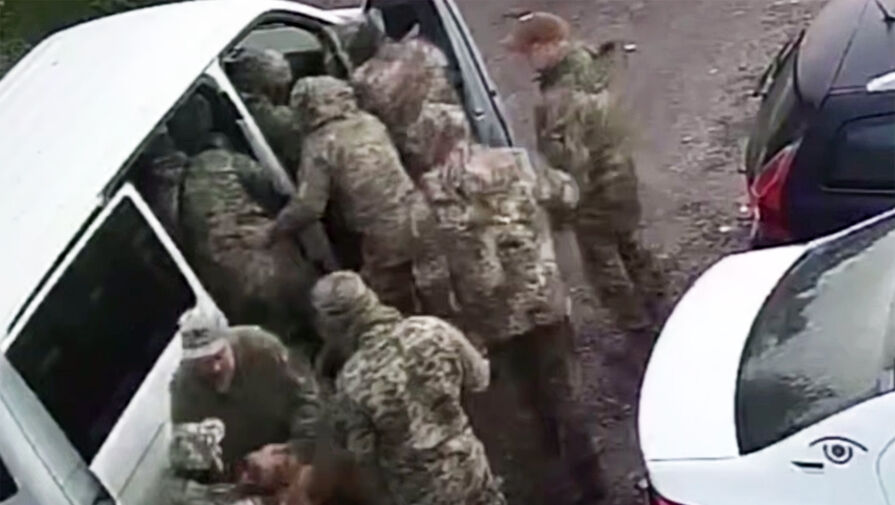 На опубликованных изданием кадрах видно, как около десяти мужчин в камуфляже силой усаживают мужчину в микроавтобус, после чего передают ему его собаку, закрывают дверь и уезжают.
