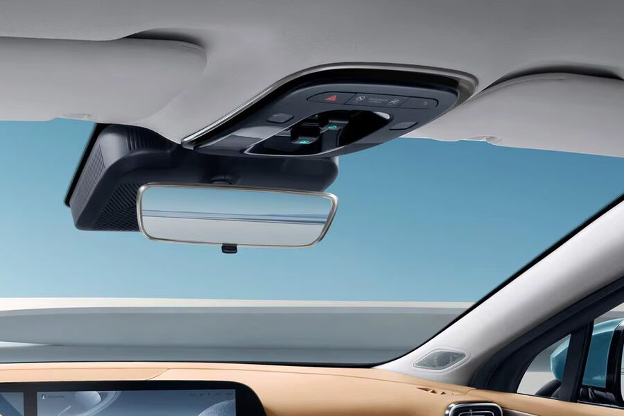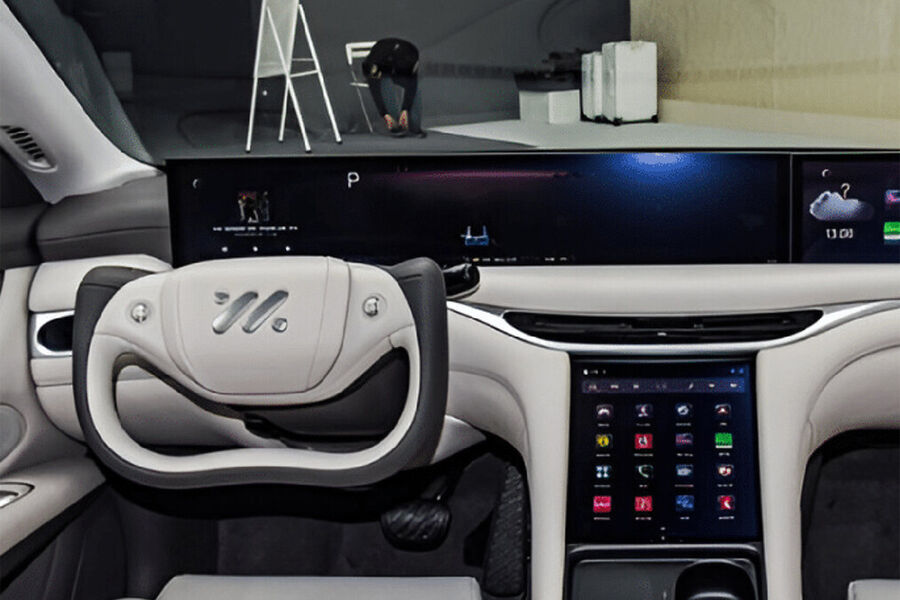 На передней панели этого автомобиля установлен экран по всей ее ширине, а обод руля сохранился только в нижней ее части. Этот седан снабжен системой автономного вождения с лидаром (лазерным радаром). Подобный руль-штурвал доступен и на американских Tesla, но только в виде опции: водитель может предпочесть обычное рулевое колесо.
