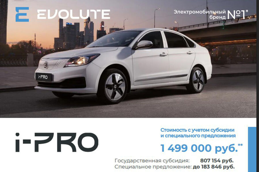 Как следует из информации на официальном сайте бренда Evolute (см. фото ниже), маркетинговая и ценовая стратегия по продвижению седана i-Pro во многом опирается на государственную субсидированную скидку, при приобретении автомобиля в кредит. Эта скидка составляет 925 тысяч рублей, но не более 35% от полной стоимости автомобиля. В момент старта продаж в 2022 году Evolute i-Pro стоил немногим меньше 3 млн рублей, что позволяло реализовать скидку полностью, говорил на тот момент глава Минпромторга Денис Мантуров.