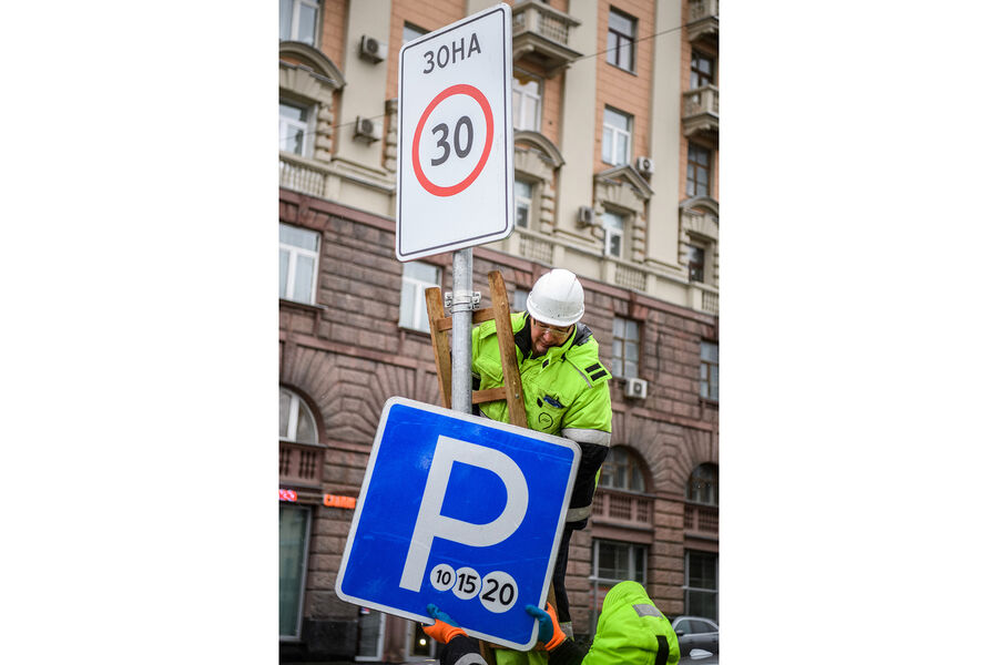 Сотрудники Центра организации дорожного движения (ЦОДД) проводят работы на одной из улиц в Москве