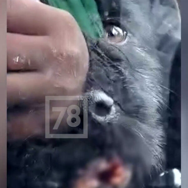 Очевидцы запечатлели инцидент на камеру. На кадрах видно, что черная собака сидит в автомобиле на переднем сиденье. У животного на нижней челюсти рана.