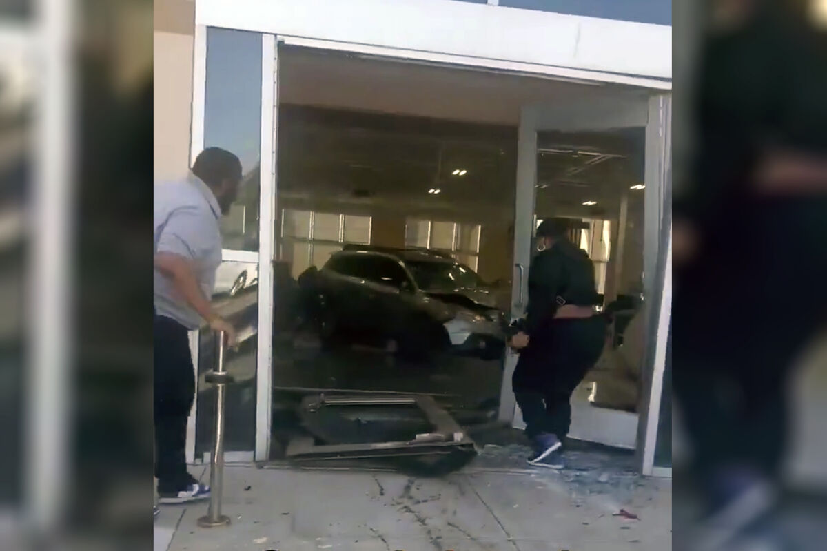 Очевидцы запечатлели происходящее на видео. На кадрах видно, как серый автомобиль заезжает в автосалон, сбивает мебель и элементы интерьера. На записи также видно, что машина ранее получила повреждения: у автомобиля оторван передний бампер и смят капот. Кроме того, на полу автосалона лежат осколки, а на видео слышны крики людей и просьбы женщины покинуть помещение.