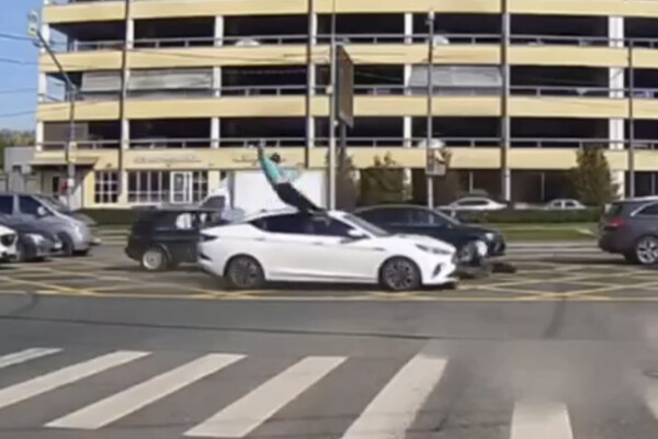 На кадрах видно, что на перекрестке в двух левых рядах скопилось большое количество автомобилей, а проезд в правом ряду свободен. Курьер на велосипеде пересек проезжую часть между стоящими автомобилями и выехал в свободный ряд. В этот момент его сбил белый седан, двигавшейся на высокой скорости.