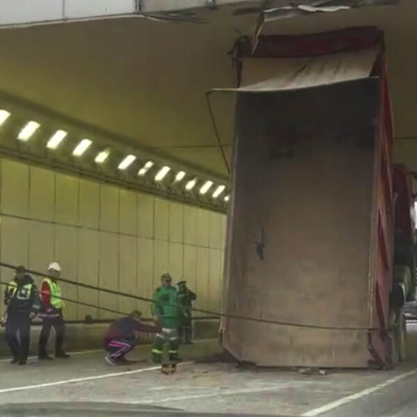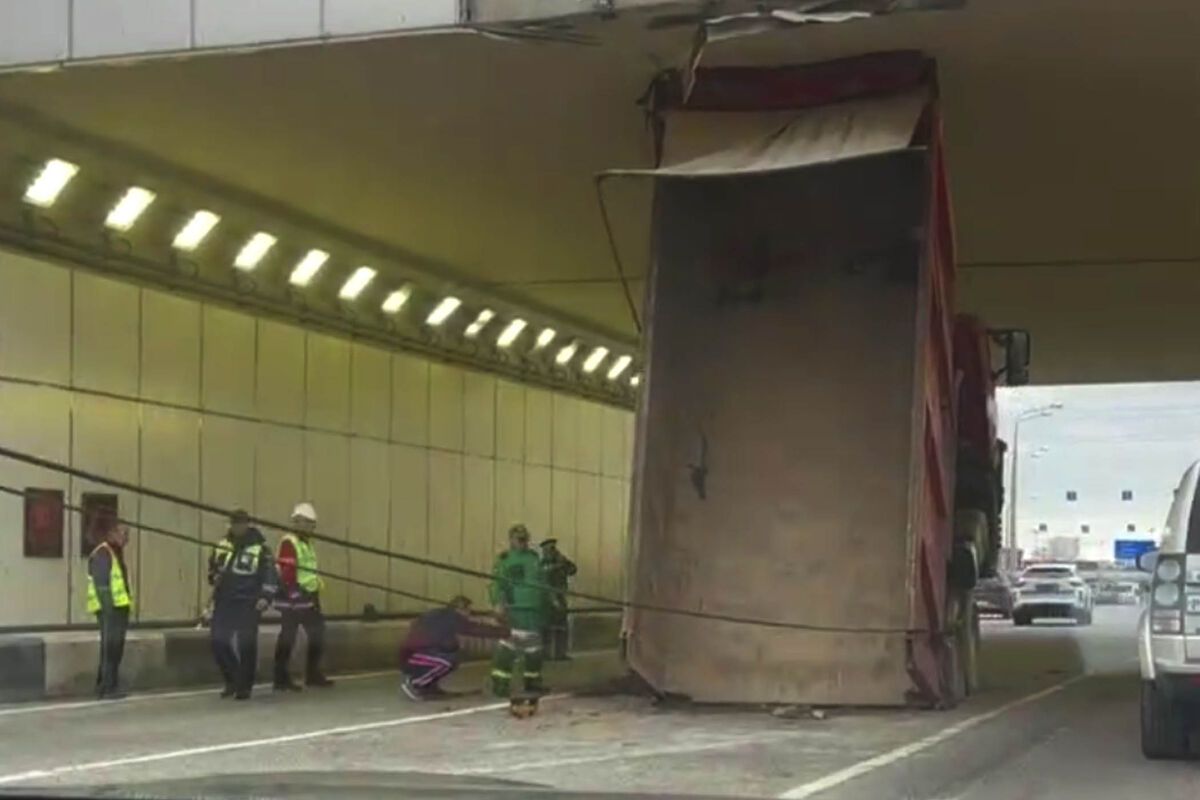 На Киевском шоссе грузовик застрял в воздухе под потолком туннеля и едва не опрокинулся. Видео произошедшего опубликовал Telegram-канал «Что там, Москва?».