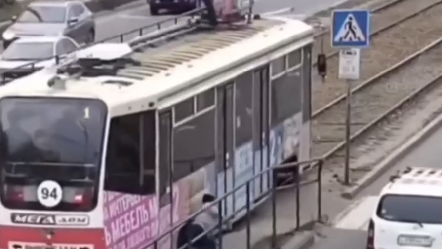 В Улан-Удэ пассажир на остановке упал под трамвай. Видеозапись произошедшего опубликовал Telegram-канал «Инцидент Россия».