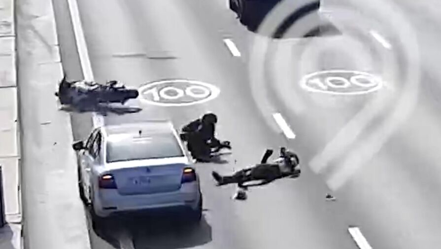 Они проскользили по инерции несколько метров и остановились. Из-под мотоцикла вырвались искры. Водитель, двигавшийся в левом ряду, смог затормозить и избежать наезда на людей.