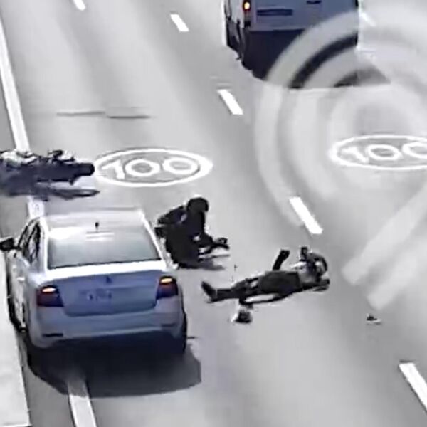 Авария произошла 14 сентября на 1-м километре МКАД. На кадрах видно, что мотоциклист перестраивается из среднего ряда в левый, в том числе проезжая по разметке между рядами движущихся автомобилей. В результате он врезался в угол фургона и упал на проезжую часть в левом ряду МКАД вместе с пассажиром и мотоциклом.