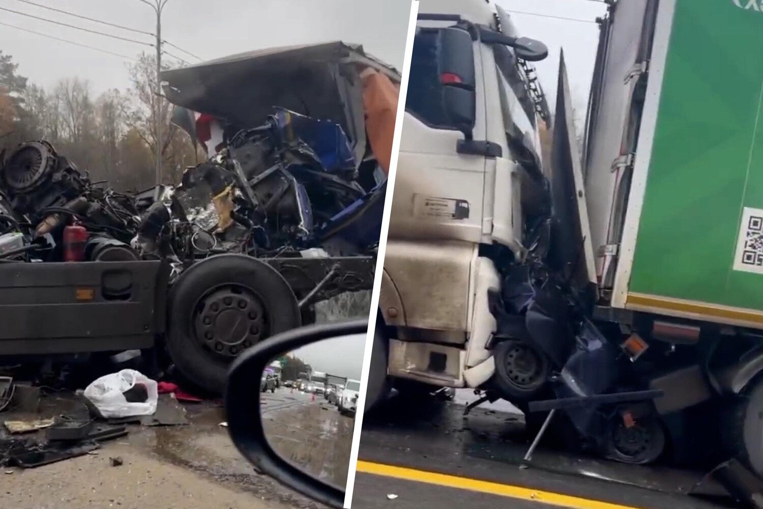 На кадрах с места происшествия видно, что в аварии участвовали не менее пяти автомобилей, которые двигались в попутном направлении. Один из них — бензовоз с полуприцепом, который врезался в фуру. У него сорвана кабина. Один из легковых автомобилей сплющило между двумя грузовиками. Также в аварии поврежден автомобиль такси и большегрузная цистерна для перевозки сыпучих грузов.