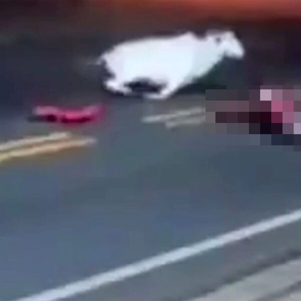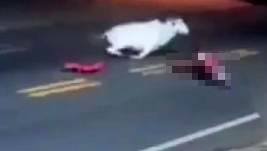 Уличная камера запечатлела инцидент. На кадрах видно, как мотоцикл на большой скорости врезается в животное, которое идет по проезжей части, и отлетает в сторону. После произошедшего корова пытается встать.