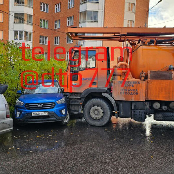 На фото с места происшествия видно, что большегрузная вакуумная цистерна для откачки нечистот остановилась поперек дороги во дворе жилого дома. Перед ее капотом на газоне — разбитый кроссовер Hyundai Creta. Также в ДТП поврежден белый седан BMW 5 Series — у него оторван задний бампер, смят багажник и левая задняя дверь.