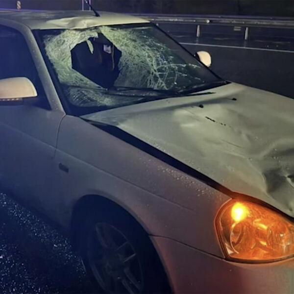 Видеорегистратор автомобиля запечатлел инцидент. На кадрах видно, что машина врезается в пешехода, от удара трескается лобовое стекло.