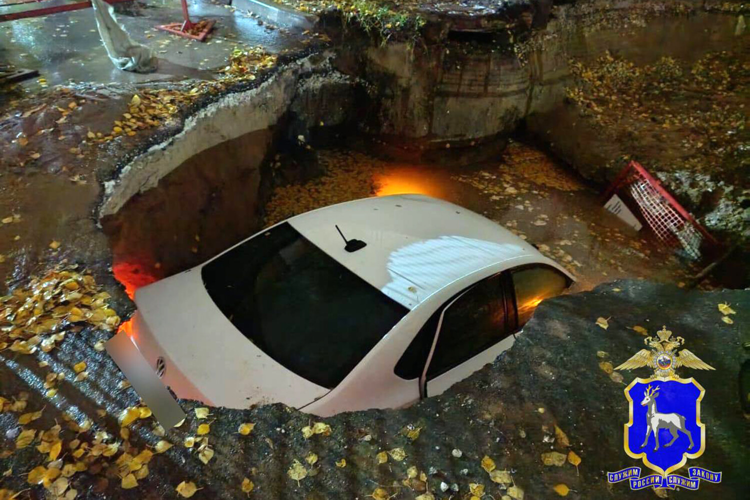 На опубликованных в сети кадрах видно, что белый автомобиль провалился в глубокую яму. По данным ведомства, в результате произошедшего никто не пострадал. Правоохранители возбудили дело об административном правонарушении. По результатам расследования будет принято процессуальное решение.
