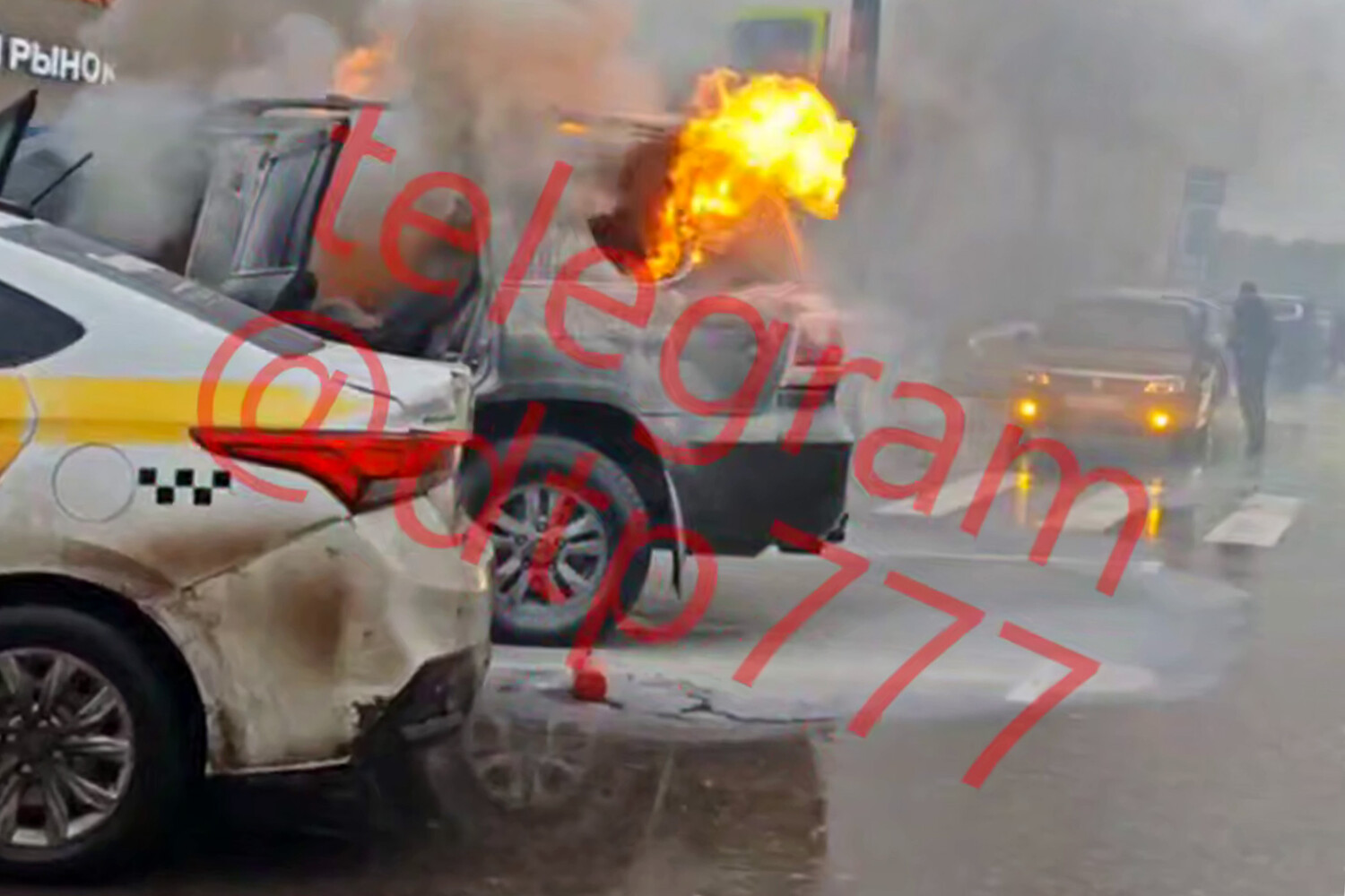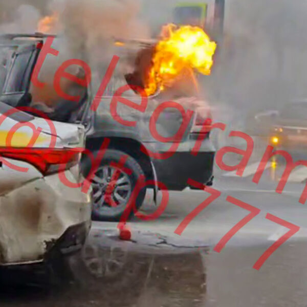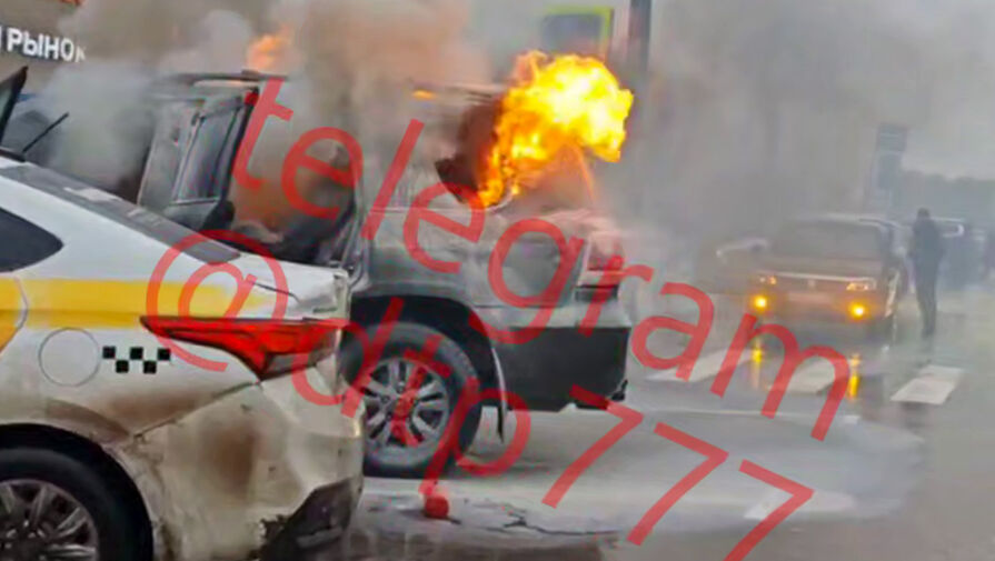 На кадрах с места происшествия виден внедорожник темно-зеленого цвета, в салоне которого разгорелся огонь. У автомобиля открыты двери и разбито одно из боковых стекол, из проема вырываются языки пламени. Рядом с ним припарковано такси. Очевидцы происшествия попытались ликвидировать пламя с помощью огнетушителей, но сделать это не удалось. На видео видны минимум три человека с автомобильными огнетушителями в руках.