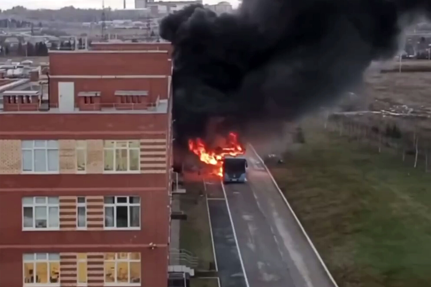На кадрах, размещенных в сети, видно, что на проезжей части горит пассажирский транспорт, при этом пламя охватило автобус не полностью. На записи также заметно, как десятки школьников уходят дальше от места возгорания. По информации канала, в результате произошедшего никто не пострадал.