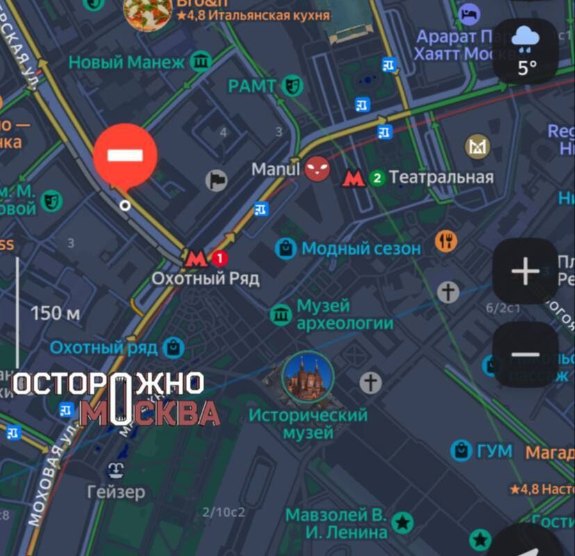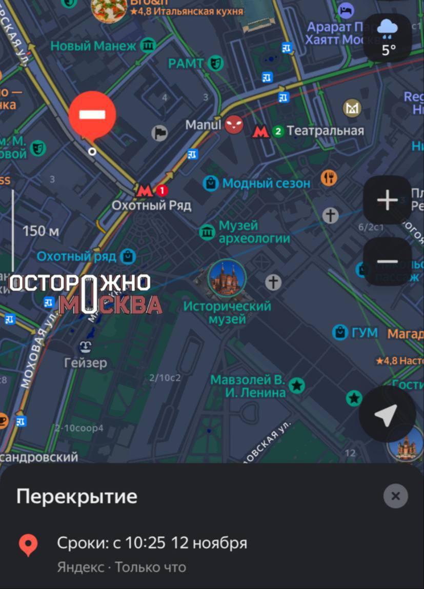 «О перекрытиях в районе Охотного ряда и Китай-города сообщают водители. По их словам, движение на улицах у Красной площади частично перекрыто, также закрыт для проезда Большой Каменный мост», — говорится в публикации.