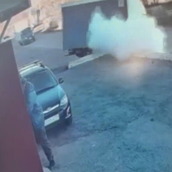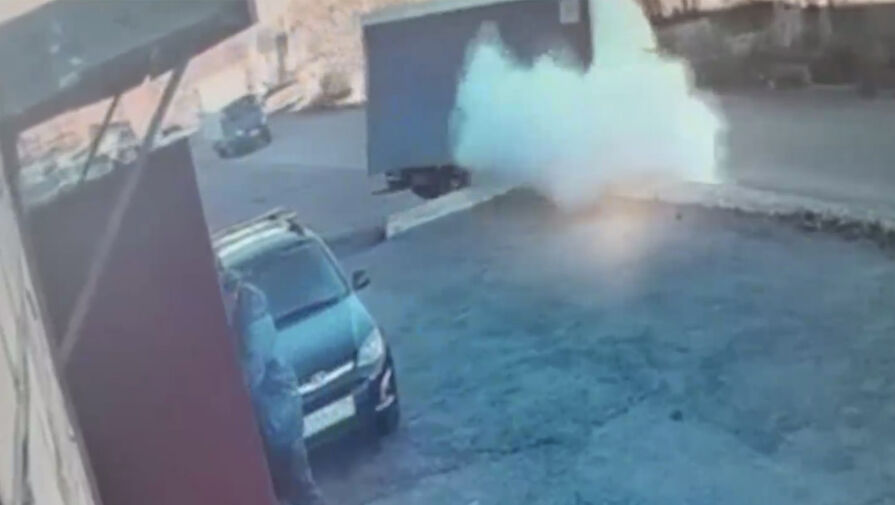 Уличная камера запечатлела инцидент. На кадрах видно, как после наезда на ограждение грузовик воспламеняется, огонь стремительно перебрасывается на припаркованную Lada Kalinа, водитель которой за секунды до произошедшего отходит от транспорта.