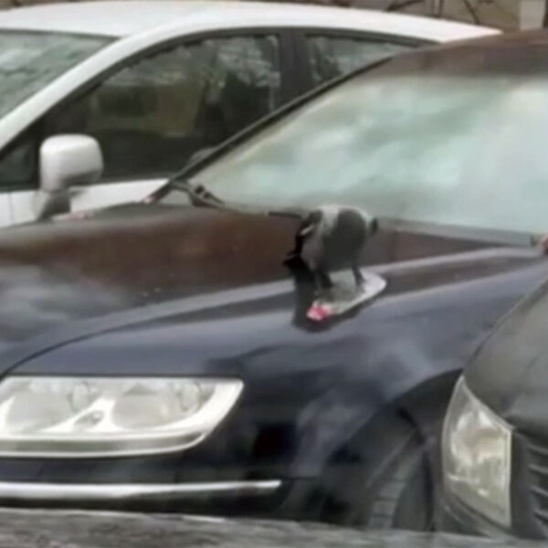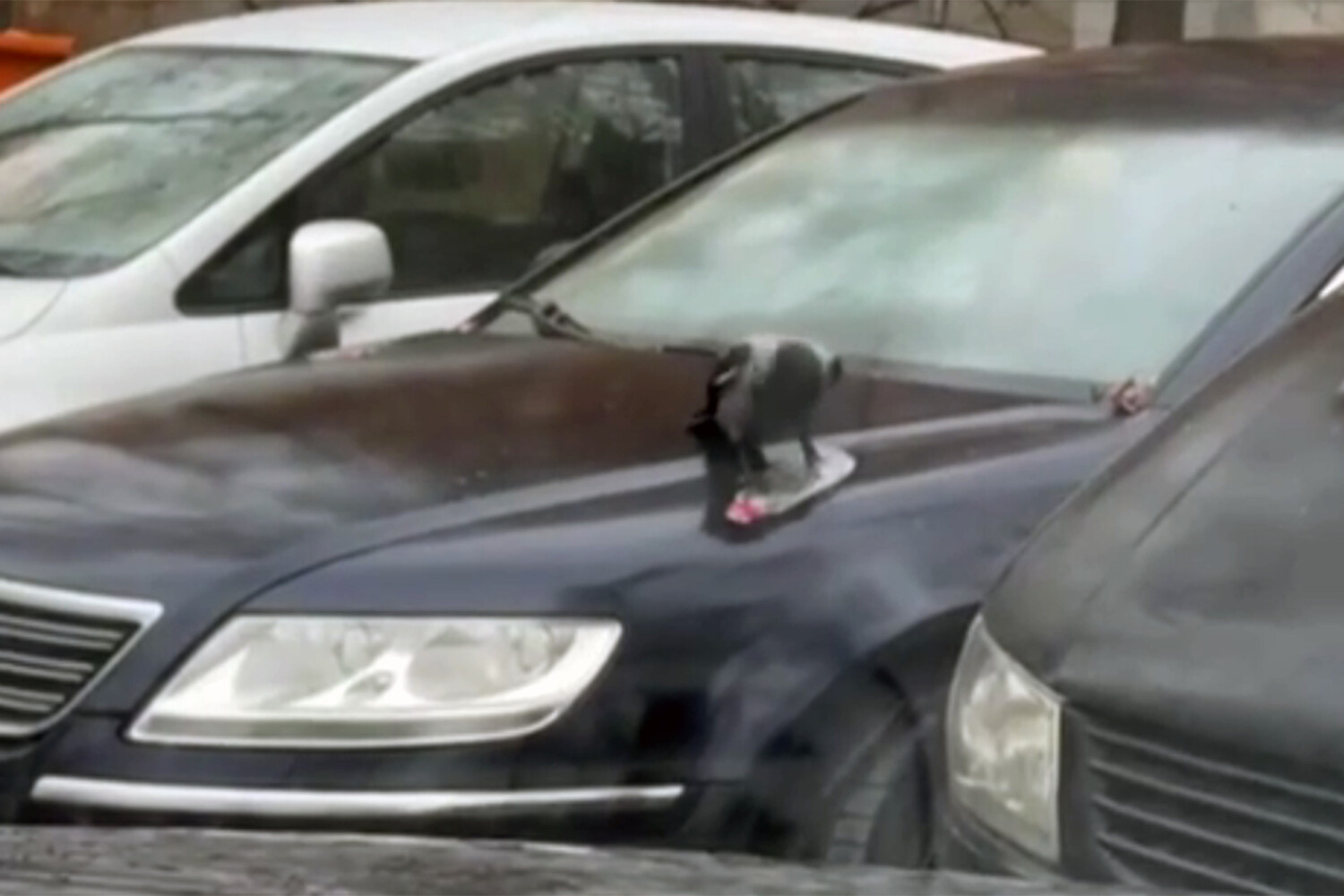 Очевидцы запечатлели инцидент на видео. На кадрах заметно, как птица катается по капоту припаркованного автомобиля на пластиковой бутылке.
