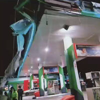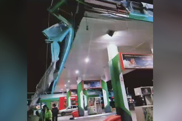 Однако, судя по кадрам, у машины во время столкновения с АЗС был поднят кузов. Именно он и повредил крышу.