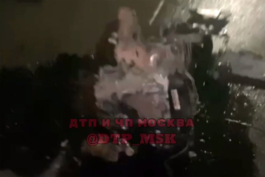 На кадрах с места ДТП видно, что двигатель автомобиля лежит на проезжей части, при этом в нескольких метрах находится поврежденная машина: у транспорта смят кузов и полностью разбито подкапотное пространство. На записи также заметно, что возле автомобиля собрались мужчины.