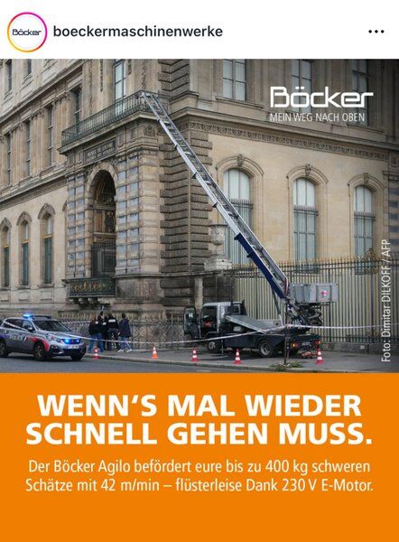 Немецкая компания Böcker Maschinenwerke, производящая подъемники, одним из которых воспользовались преступники, похитившие ценности из Лувра, воспользовалась инцидентом, чтобы прорекламировать свою продукцию. Об этом пишет газета Bild.