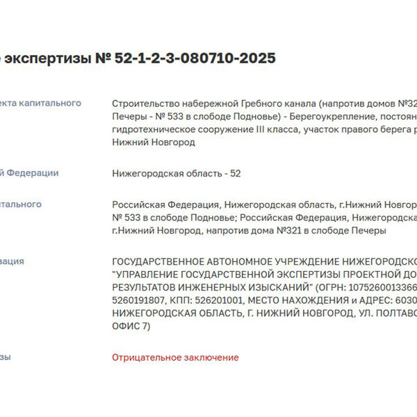 Дочерняя структура девелопера GloraX не смогла получить положительное заключение госэкспертизы по проекту набережной Гребного канала в Нижнем Новгороде.