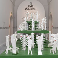 Пространство выставки выстроено как ритуальный сказочный маршрут — ни одному герою не удавалось избежать перепутья и выбора. Не удается это и человеку на протяжении всей жизни. От застолья расходятся два символических маршрута. Правая ветвь посвящена циклическим переходам, которые человек не властен изменить. И тут снова уместно вспомнить, как принято было в народе провожать одно и встречать другое время года. Мы и сегодня повторяем эти обряды, сжигая чучело Зимы на Масленицу или радуемся урожаю на Яблочный спас. Все это отголоски традиционных ритуалов в нашей культуре.