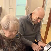 На видео показано, как Крутой фотографируется с 95-летней Александрой Пахмутовой, а также играет с ней на музыкальном инструменте в четыре руки.