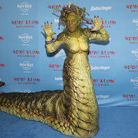 На своей ежегодной вечеринке в честь Дня всех святых она представила костюм героини греческой мифологии Медузы Горгоны со змеями вместо волос и хвостом гремучей змеи. Образ дополнили зеленая краска на лице и заостренный зубы.