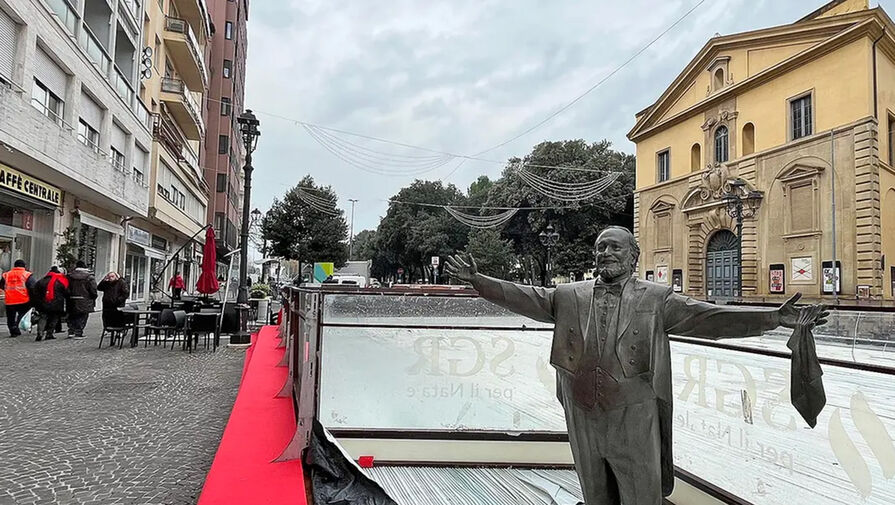 Статуя, изображающая маэстро в концертном костюме с распростертыми объятиями, оказалась посреди будущего рождественского катка — сейчас она по колено утопает в деревянных конструкциях, установленных на центральной площади города.
