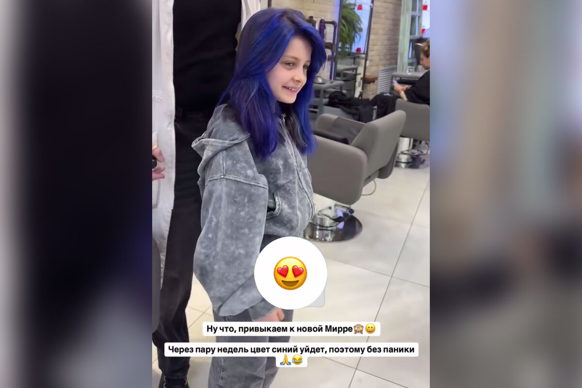 «Привыкаем к новой Мирре. Через пару недель синий цвет уйдет, поэтому без паники. Запрет намного хуже, нежели обсуждение и разумный подход к таким вот изменениям. Мирра начала красить волосы еще зеленкой и сама себя стригла. Но лучше пусть экспериментирует под нашим присмотром и руками профессионалов. Согласитесь? Лучше на раннем этапе все это пройти и потерять интерес, чем жить в запрете, а потом пуститься во все тяжкие. Когда еще экспериментировать, если не в детстве? Мы позволяем то, что не запрещено законом», — высказалась знаменитость.