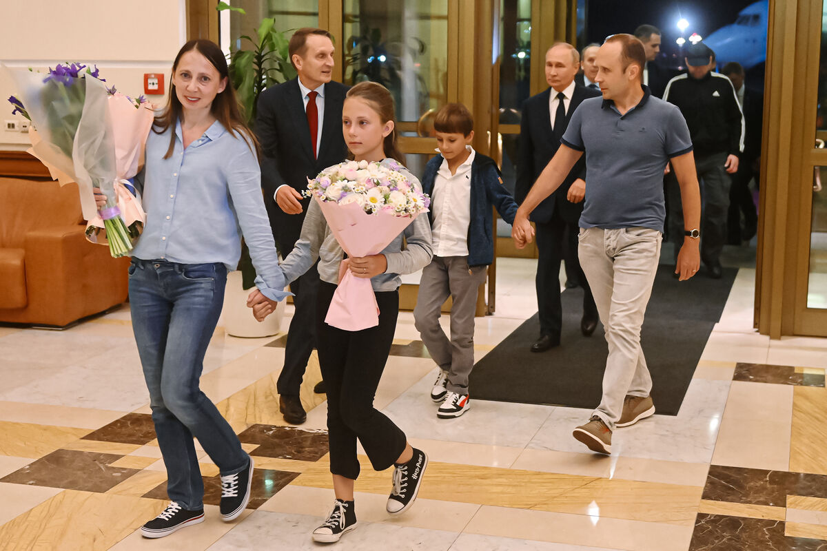 В Россию, помимо Дульцевых, вернулся Вадим Красиков, приговоренный к пожизненному заключению в Германии за ликвидацию чеченского полевого командира. На Запад улетели журналист WSJ Эван Гершкович, бывший морской пехотинец Пол Уилан, публицист Владимир Кара-Мурза (признан в РФ иностранным агентом и внесен в список террористов и экстремистов) (признан в РФ иностранным агентом) и бывший столичный муниципальный депутат Илья Яшин (признан в РФ иностранным агентом).