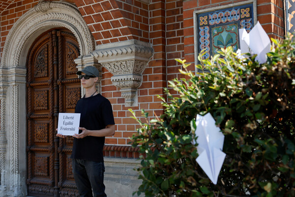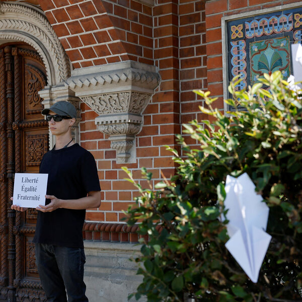 По его словам, он решил проявить солидарность, придя с картонным плакатом, на котором по-французски написано «Свобода, равенство, братство». Подчеркивается, что его не задержали.