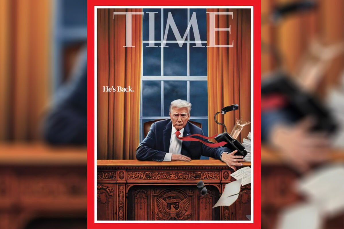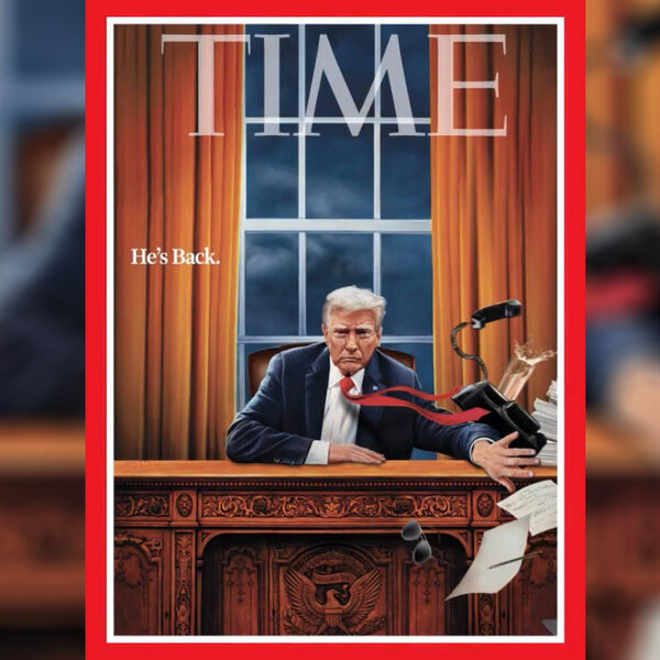 Ее автором является художник Тим О'Брайен. Он изобразил политика в Овальном кабинете Белого дома. Трамп скидывает с поверхности стола документы, телефон и солнечные очки, которые напоминают те, в которых нередко появлялся его предшественник Джо Байден. На обложке написано: «Он вернулся».