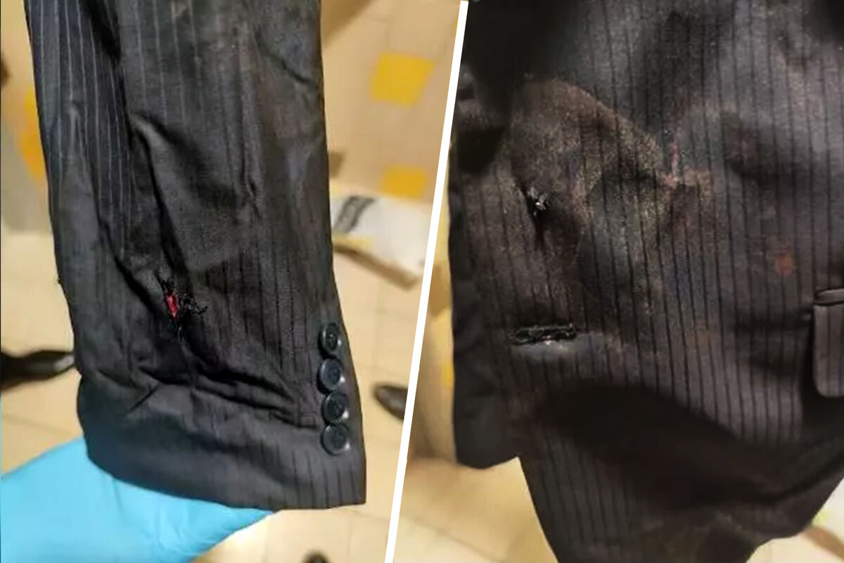 По словам главы оборонного ведомства, он сделал несколько фото в больнице, куда был доставлен Фицо. Калиняк достал смартфон и показал снимки, на которых запечатлены пиджак с небольшими отверстиями и запекшейся кровью, а также окровавленная рубашка.