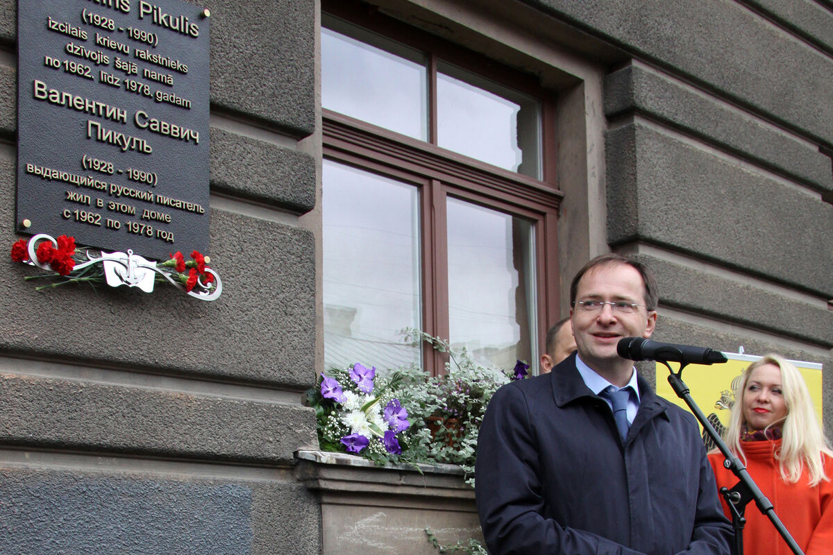 Мединский поделился, что в 2014 году они вместе с товарищем установили за свои средства мемориальную доску на доме в латвийской столице, где жил Пикуль. По его словам, власти не согласовали установку мемориальной доски из «красивой бронзы», поэтому им «пришлось делать» ее «скромно, как требовали, на двух языках».