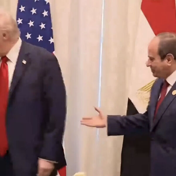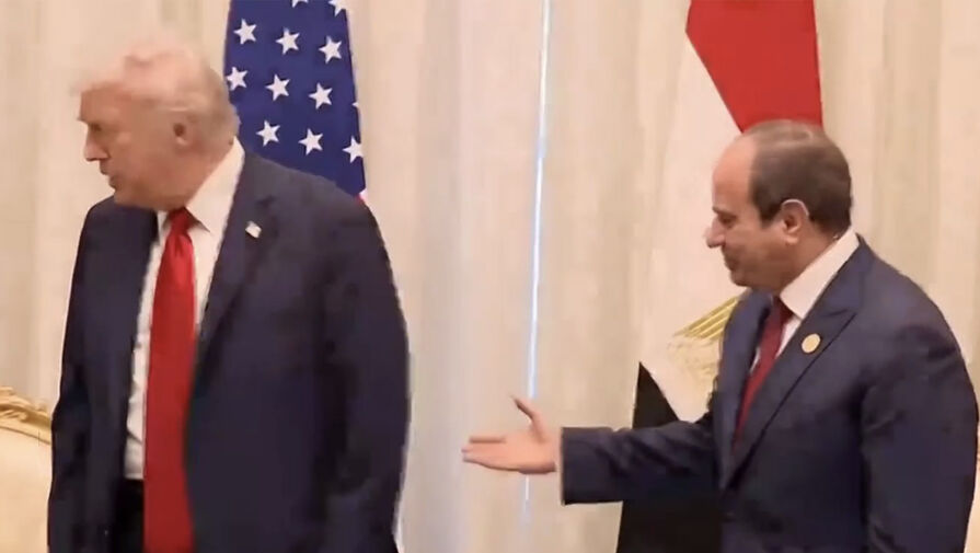 На кадрах видно, как лидеры здороваются. Затем глава Египта протягивает руку американскому коллеге. Однако Трамп продолжает говорить и не видит жеста ас-Сиси, а затем садится на место.