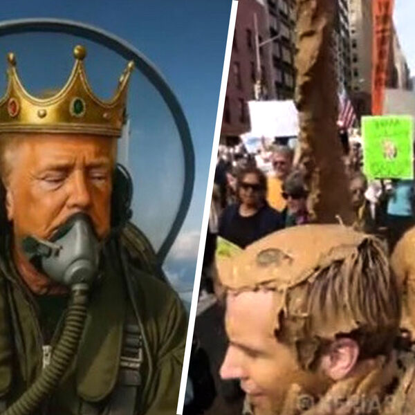 На кадрах изображено, как американский лидер в образе монарха летит на истребителе. В какой-то момент он начинает сбрасывать большое количество грязи, которая падает на митингующих.