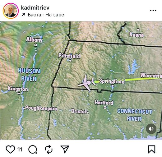 Спецпредставитель президента России и глава РФПИ Кирилл Дмитриев опубликовал в Instagram (владелец компания Meta признана в России экстремистской и запрещена) фотографию, на которой виден маршрут самолета, пролетающего над американским городом Спрингфилд. Публикацию он сопроводил песней Басты «На заре».