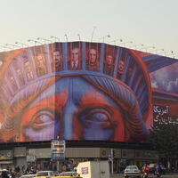 В Тегеране появился новый антиамериканский плакат, высмеивающий президента Украины Владимира Зеленского, по случаю 46-й годовщины захвата посольства США в столице Ирана. Об этом сообщает ТАСС.