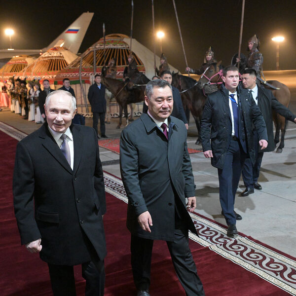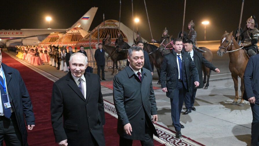 Мелодию исполнил фольклорно-этнографический ансамбль. В аэропорту российского лидера лично встретил президент Киргизии Садыр Жапаров.