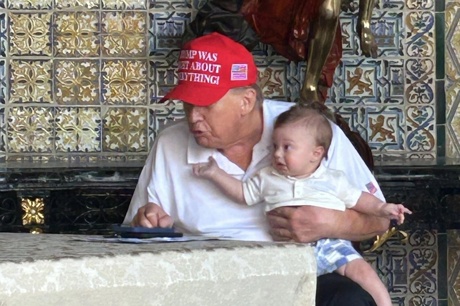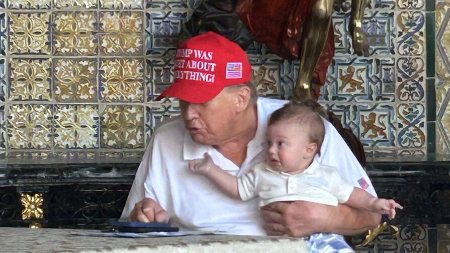 На фотографии Дональд Трамп сидит за столом и держит внука на коленях. При этом он смотрит не на мальчика, а в экран своего телефона. В это время малыш активно жестикулирует и надувает губы.