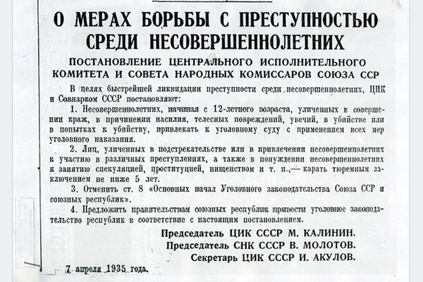 «В целях быстрейшей ликвидации преступности среди несовершеннолетних ЦИК и СНК Союза ССР постановляют: несовершеннолетних начиная с 12-летнего возраста, уличенных в совершении краж, в причинении насилия, телесных повреждений, увечий, в убийстве или в попытках к убийству, привлекать к уголовному суду с применением всех мер уголовного наказания <...>», — гласило постановление СНК «О мерах борьбы с преступностью среди несовершеннолетних» от 7 апреля 1935 года.