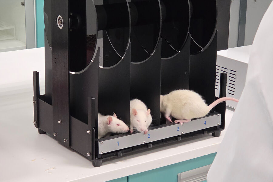 Лаборатория разделена на несколько комнат, в двух из которых проводят эксперименты с крысами. В одной из них животных подвергают стрессу, чтобы потом протестировать на них новый антидепрессант. Для этого их загоняют в большой лабиринт, который пока пустует, или заставляют бежать на специальном круглом стержне. Если какая-то крыса падает в специальный контейнер, лаборант сразу поднимает ее и возвращает на место, чтобы она продолжала бежать. Отсутствие отдыха повергает крыс в стресс, который и нужен для испытаний.